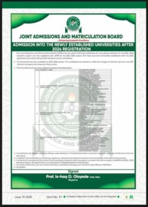 The Joint Admissions and Matriculation Board (JAMB) has released a list of new universities candidates of the 2025 Unified Tertiary Matriculation Examination (UTME) can apply to for admission. JAMB explained that the new universities were established after the 2024 UTME registration.
