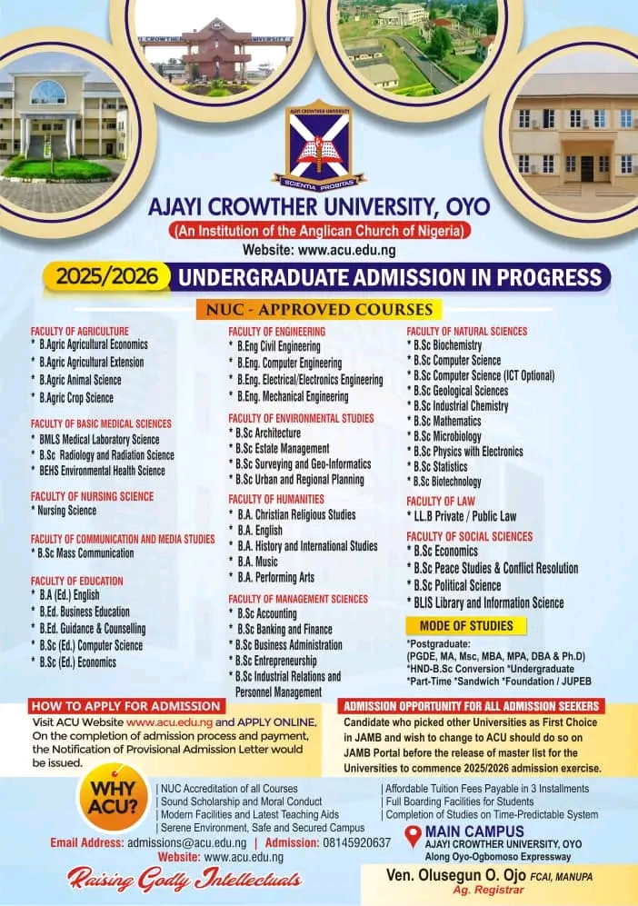 AJAYI CROWTHER UNIVERSITY, OYO [ACU] RELEASES POST UTME ADMISSION FORM FOR 2025/2026 ACADEMIC SESSION