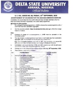 The Management of Delta State University (DELSU), Abraka, has announced the release of its Change of Course Form for the 2025/2026 admission exercise.