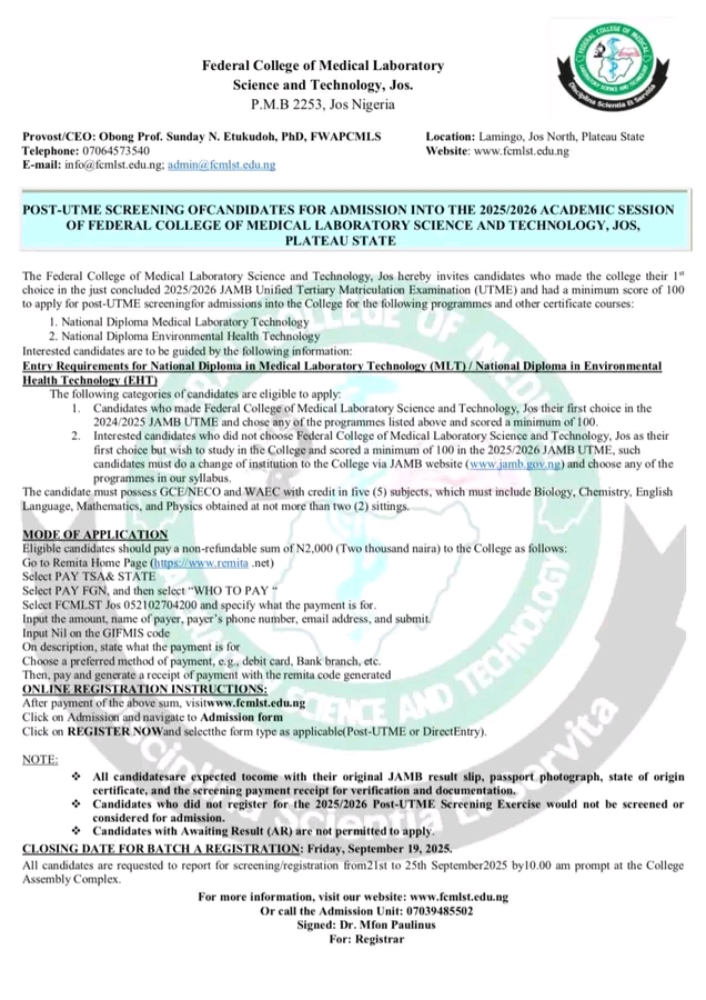 The Federal College of Medical Laboratory Science and Technology, Jos hereby invites candidates who made the college their 1st choice in the just concluded 2025/2026 JAMB Unified Tertiary Matriculation Examination (UTME) and had a minimum score of 100 to apply for Post-UTME screeningfor admissions into the College for the following Programmes and other certificate courses: