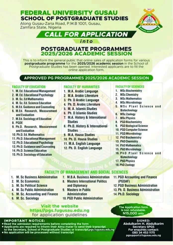 FEDERAL UNIVERSITY GUSAU (FUGUSAU) RELEASES POSTGRADUATE ADMISSION FORM FOR 2025/2026 ACADEMIC SESSION