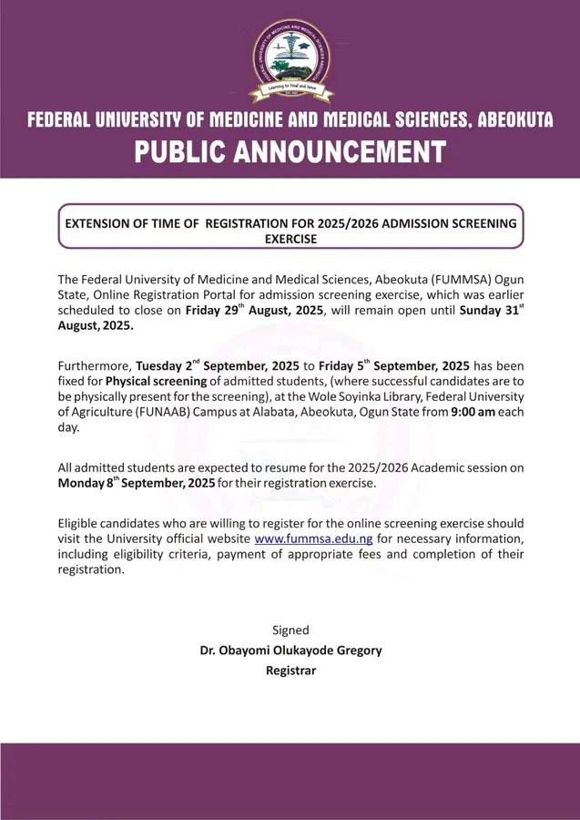 The Federal University of Medicine and Medical Sciences, Abeokuta (FUMMSA), Ogun State, online registration portal for admission screening exercise, which was earlier scheduled to close on Friday 29th August, 2025, will remain open until Sunday 31st August, 2025.