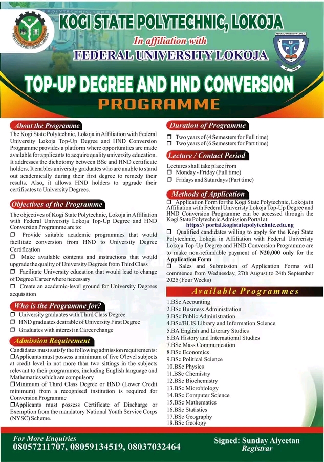 The Kogi State Polytechnic, Lokoja in affiliation with Federal University Lokoja Top-Up Degree and HND Conversion Programme provides a platform where opportunities are made available for applicants to acquire quality university education. It addresses the dichotomy between BSc and HND certificate holders. It enables university graduates who are unable to stand out academically during their first degree to remedy their results. Also, it allows HND holders to upgrade their certificates to University Degrees.