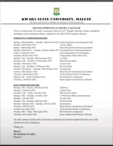 Kwara State University has officially released its academic calendar, providing a clear schedule of academic activities for the session. The calendar outlines important dates for lectures, examinations, breaks, and other key events, serving as a guide for both students and staff