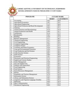 LADOKE AKINTOLA UNIVERSITY OF TECHNOLOGY, OGBOMOSO RELEASE 2025/2026 DEPARTMENTAL CUT-OFF MARKS
