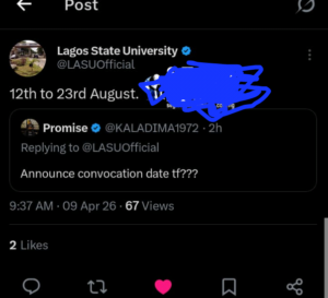 The indication came via the university’s official X (formerly Twitter) handle, @LASUOfficial, in response to a user’s enquiry about the convocation date.