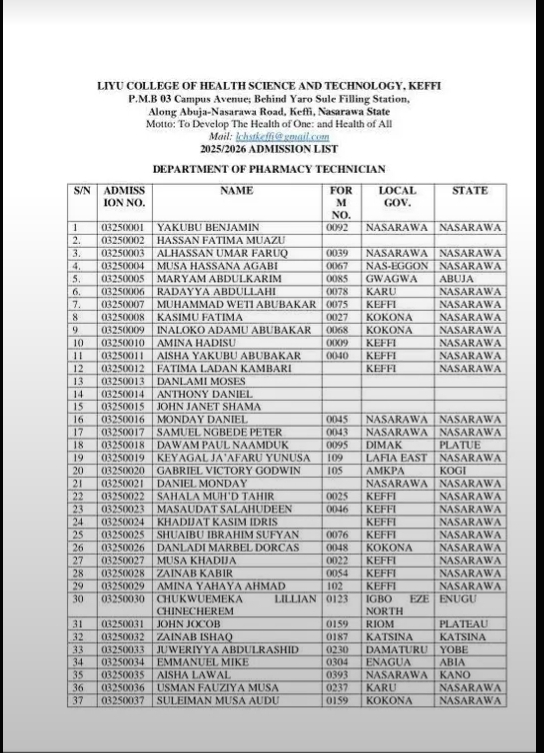 This is to inform the general public, particularly prospective students of the Liyu College of Health Sciences and Technology, Keffi, that the school management has officially released the Batch A admission list of successful candidates for the 2025/2026 academic session. This release marks a major step forward in the college’s admission process and reflects the institution’s continued commitment to academic excellence, transparency, and timely communication with applicants.