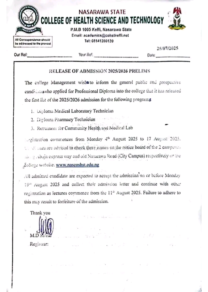 The Management of the Nasarawa State College of Health Sciences and Technology, Keffi wishes to inform the general public, particularly prospective candidates who applied for admission into the College for the 2025/2026 academic session, that the first batch admission list for Professional Diploma programmes has been officially released. This list contains the names of successful applicants offered admission into the following programmes: Diploma in Medical Laboratory Technician, Diploma in Pharmacy Technician, and Retrainees for both Community Health and Medical Laboratory.