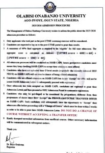 The Management of Olabisi Onabanjo University wishes to inform the public about the 2025/2026 admission procedure as follows: