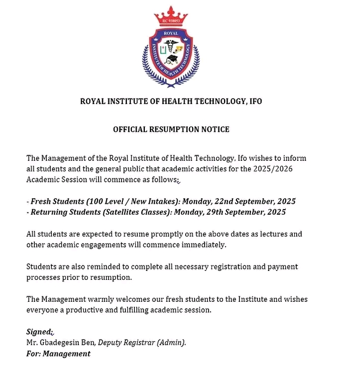 The Management of the Royal Institute of Health Technology, Ifo wishes to inform all students, both new and returning, as well as the general public, that academic activities for the 2025/2026 academic session have been officially scheduled to commence as follows:
