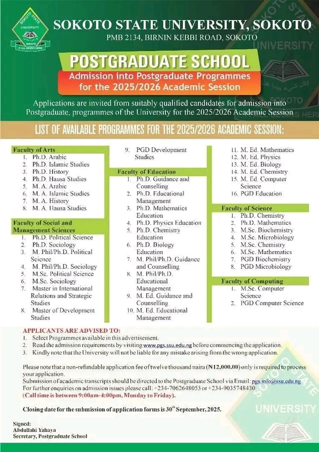 Applications are invited from suitably qualified candidates for admission into postgraduate programmes of the Sokoto State University for the 2025/2026 academic session.