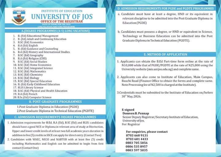 This is to inform the general public especially prospective students that the management of the University of Jos (UNIJOS) has commences the Sales of Application forms for the 2026 Long Vacation Part-time Programme.