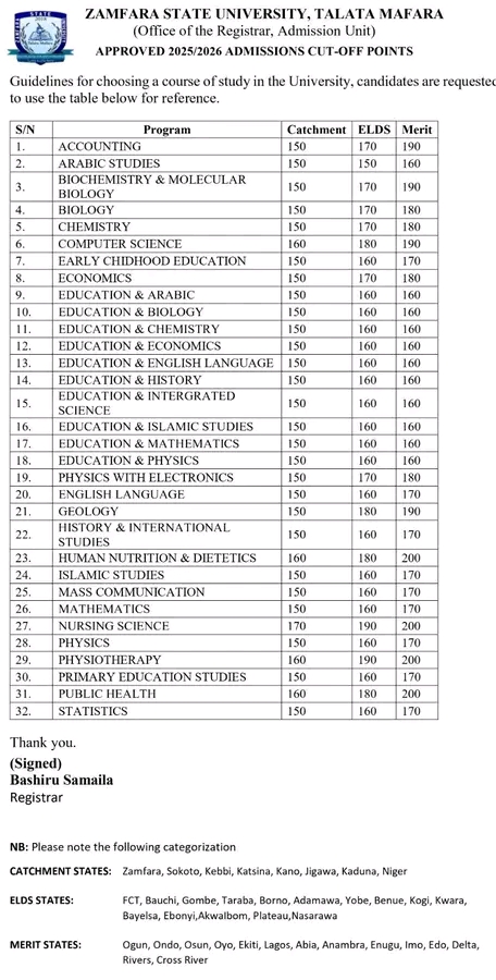 This is to inform the general public, especially all prospective students of Zamfara State University (ZAMSU), that the school management has officially released the approved cut-off marks for the various academic programmes offered by the University for the 2025/2026 Academic Session admission exercise.